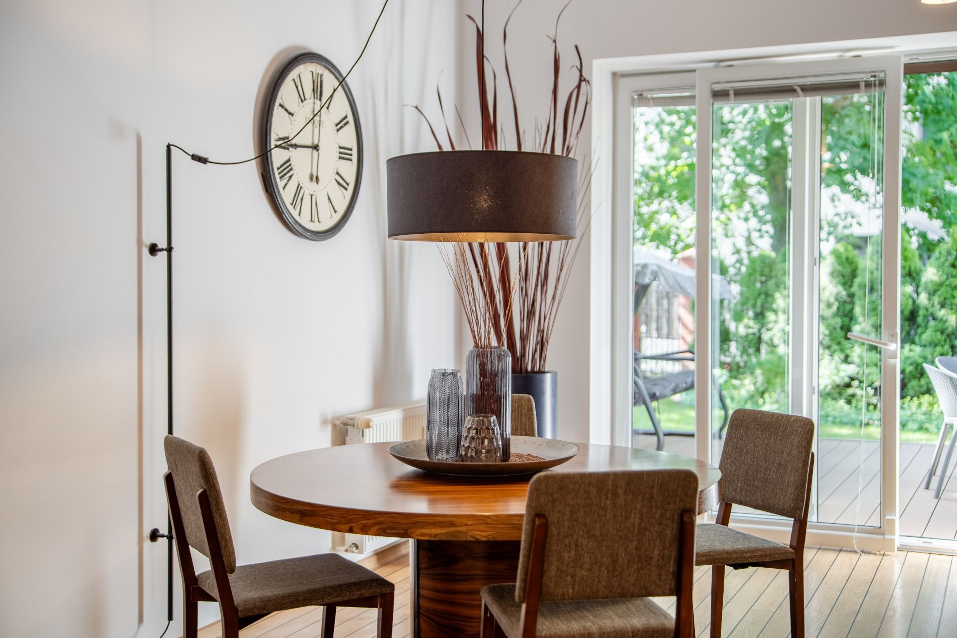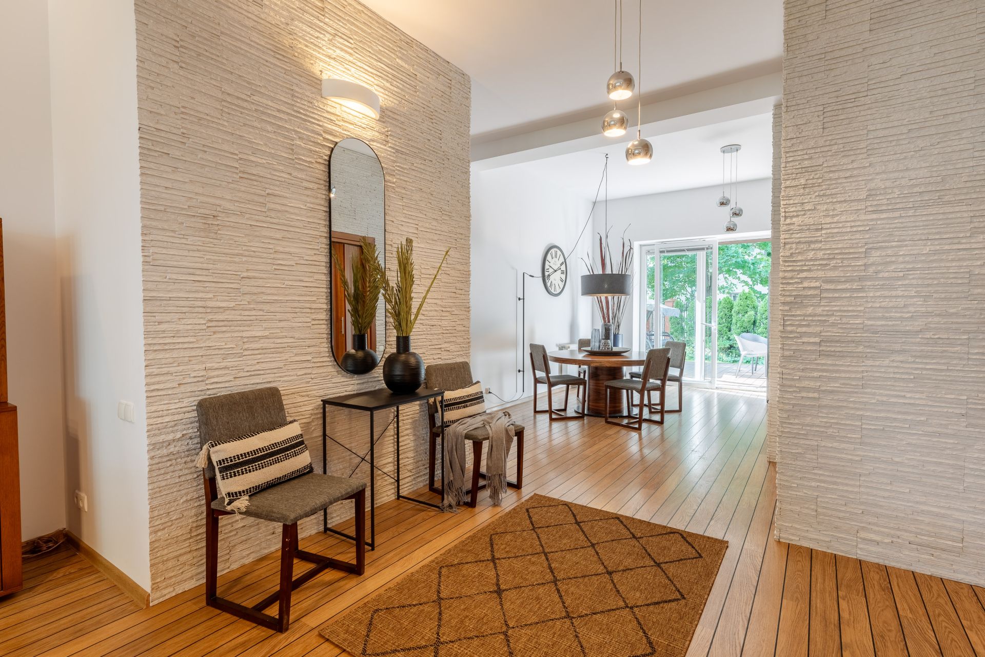 duży, jasny salon z częścią wypoczynkową i jadalnianą,